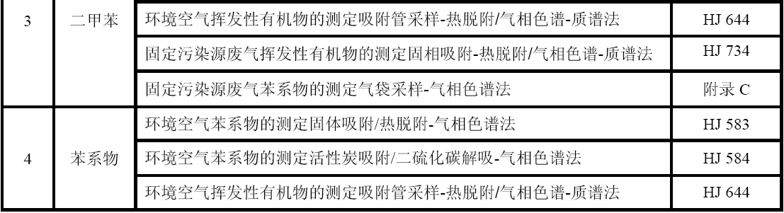 GB 16297 大氣污染物綜合排放標準 GB 24409 汽車涂料中有害物質限量 GB/T 15089 機動車輛及掛車分類 GB/T15432 環境空氣總懸浮顆粒物的測定重量法 GB/T 16157 固定污染源排氣中顆粒物測定與氣態污染物采樣方法 HJ 583 環境空氣苯系物的測定固體吸附/熱脫附-氣相色譜法 HJ 584 環境空氣苯系物的測定活性炭吸附/二硫化碳解吸-氣相色譜法 HJ 644 環境空氣揮發性有機物的測定吸附管采樣-熱脫附/氣相色譜-質譜法 HJ 732 固定污染源廢氣揮發性有機物的采樣氣袋法 HJ 734 固定污染源廢氣揮發性有機物的測定固相吸附-熱脫附/氣相色譜-質譜法 HJ/T 38 固定污染源排氣中非甲烷總烴的測定氣相色譜法 HJ/T 55 大氣污染物無組織排放監測技術導則 HJ/T 75 固定污染源煙氣排放連續監測技術規范(試行) HJ/T 194 環境空氣質量手工監測技術規范 HJ/T 293 清潔生產標準汽車制造業(涂裝) HJ/T 397 固定源廢氣監測技術規范 《建設項目環境保護設施竣工驗收監測技術要求(試行)》(環發(2000)38號)